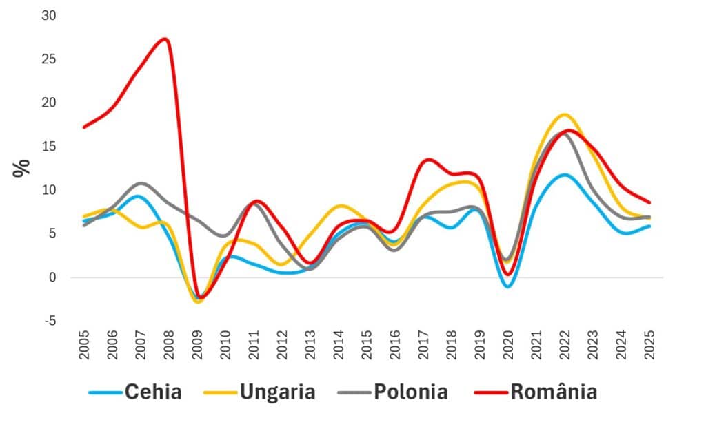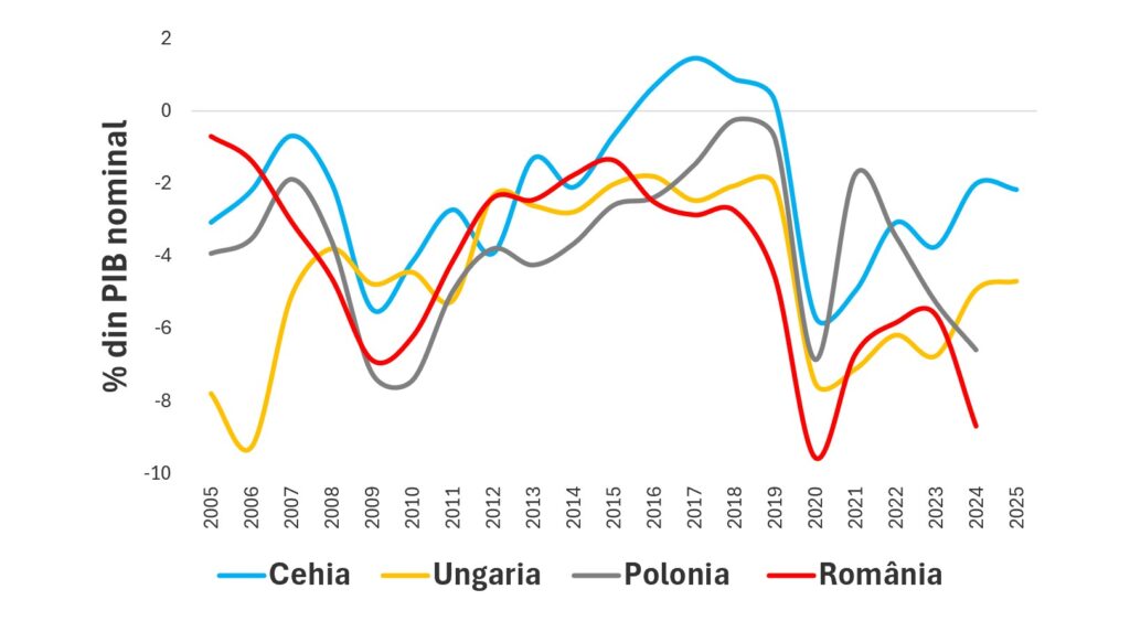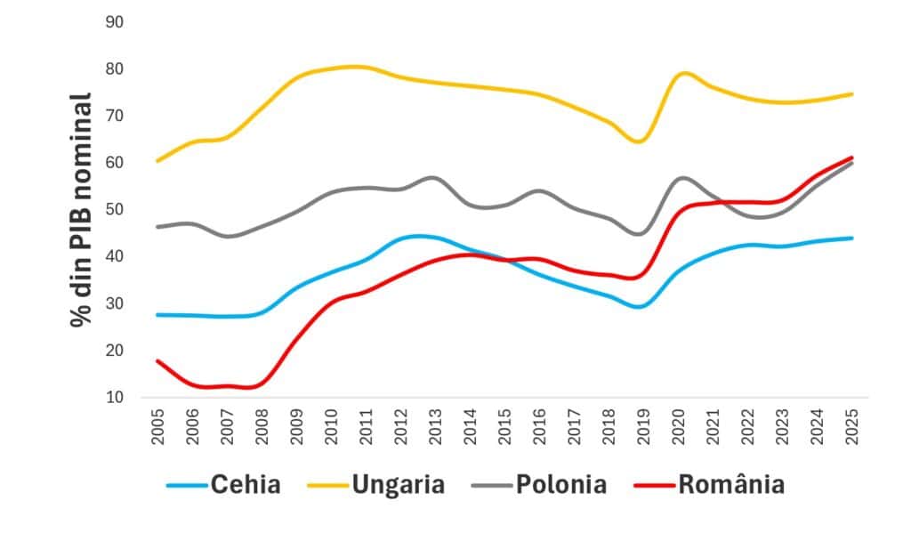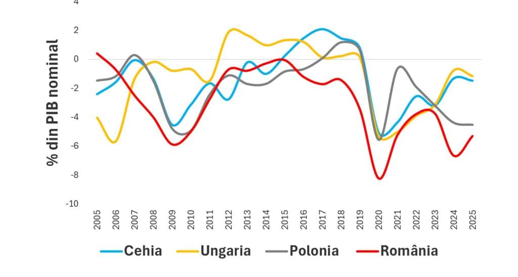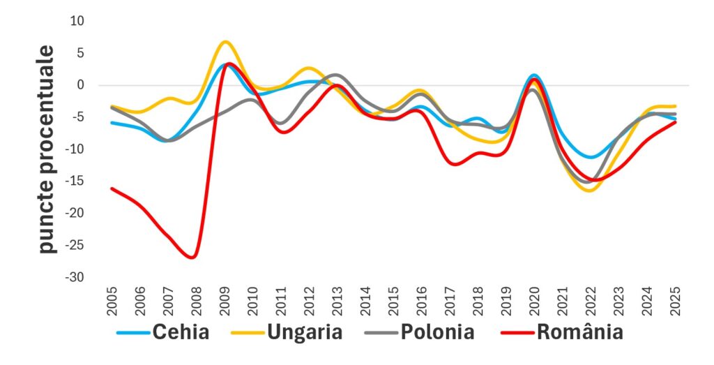Pentru perioada considerată, 2005-2025, diferențialul ’r–g’ a fost preponderent negativ. Totodată, el crește și poate ajunge în teritoriu pozitiv atunci când creșterea nominală a PIB se reduce semnificativ și poate fi chiar negativă (contracție economică). În cazul țării noastre, diferențialul ’r–g’ s-a situat, în general, sub nivelul înregistrat în cazul celorlalte țări din regiune.