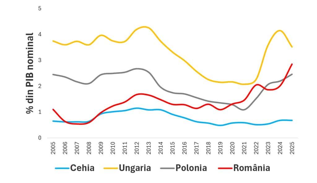 De exemplu, Ungaria are cea mai mare datorie publică din regiune ca pondere în PIB nominal. Acest aspect se reflectă și în evoluția cheltuielilor pentru serviciul datoriei publice. În cazul țării noastre, creșterea abruptă a datoriei publice după izbucnirea pandemiei de Covid-19 a survenit concomitent cu o creștere semnificativă a costurilor cu dobânzile pentru datoria publică. Dacă ne uităm la anul 2022, putem observa că țara noastră a avut o cheltuială cu dobânzile (exprimată ca pondere în PIB) care a depășit-o pe cea a Poloniei, devenind a doua cea mai ridicată din regiune, situație care s-a menținut până în prezent.