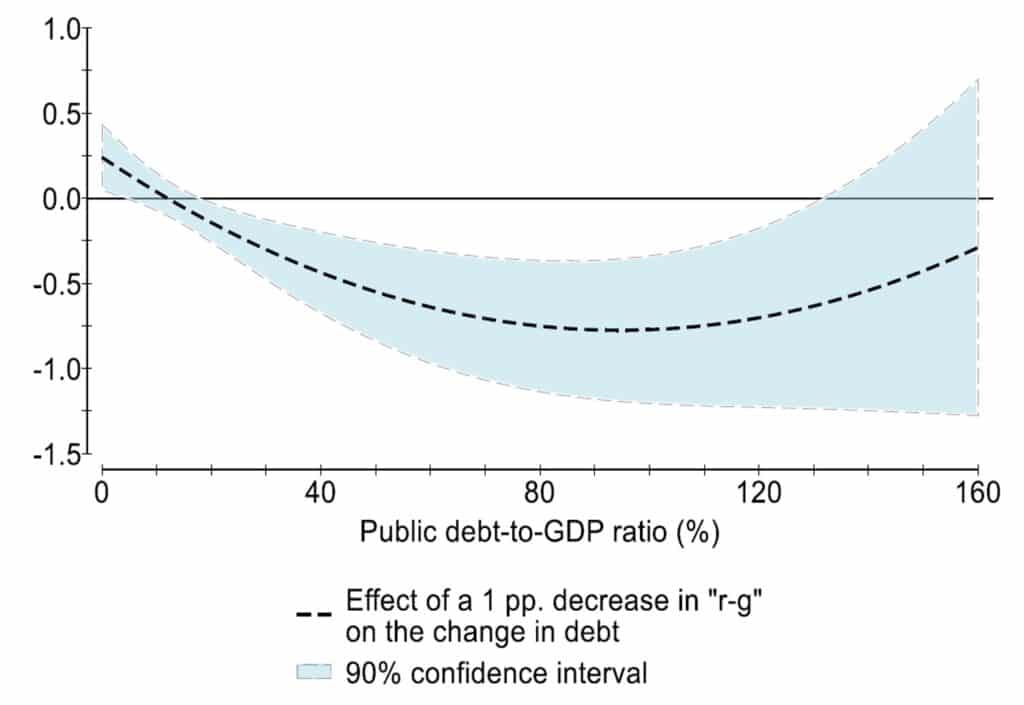 Practic, un ’r-g’ negativ este benefic pentru evoluția datoriei publice în sensul că atenuează din creșterea datoriei publice ca pondere în PIB. În literatura de specialitate, contribuția autonomă a diferențialului dintre rata dobânzii (r) și rata de creștere economică (g) asupra dinamicii datoriei publice poartă numele de efect al bulgărelui de zăpadă (snowball). Boussard și Mohl (2021), în lucrarea Fiscal policy in a negative interest rate-growth differential environment – new evidence, subliniază faptul că, la nivelul Uniunii Europene, impactul diferențialului ’r-g’ asupra datoriei publice este unul neliniar. Mai exact, impactul diferențialului ’r–g’ este cu atât mai mare cu cât nivelul datoriei este mai mare, însă până la un punct, după care nivelul impactului începe să scadă.
