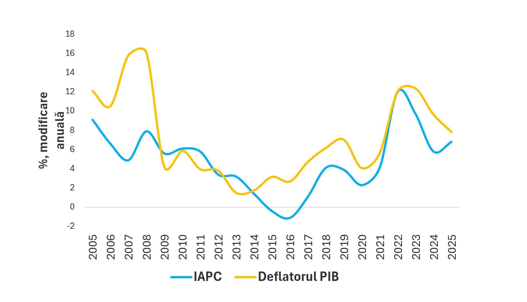 În figura de mai jos regăsim modificarea anuală a indicelui armonizat al prețurilor de consum sau a ratei inflației (conform statisticilor Eurostat, se raportează media anuală a indicelui IAPC lunar, deci modificarea acestuia reprezintă rata medie anuală a inflației), respectiv cea a deflatorului PIB. După cum se poate observa dintr-o simplă inspecție vizuală, dinamica anuală pentru cei doi indici a fost foarte apropiată în anumite perioade de timp, dar au existat și perioade caracterizate de decuplare semnificativă. Corelația dintre modificarea anuală a IAPC și cea a deflatorului PIB pentru perioada 2005-2025 este de aproximativ 72,3%, prin urmare una relativ ridicată. Observăm faptul că în perioada anterioară crizei financiare din 2008-2009, dinamica anuală a deflatorului PIB a fost sistematic și semnificativ peste cea a IAPC. Dacă ne uităm la perioada post-criză, adică perioada 2012-2025, corelația dintre cele două dinamici crește la aproximativ 85,4%. Pe de altă parte, dacă excludem perioada de după izbucnirea crizei pandemice și luăm în considerare perioada 2012-2019, corelația dintre variația anuală a IAPC și deflatorul PIB scade la aproximativ 67,1%. Prin urmare, legătura dintre variația anuală a IAPC și deflatorul PIB depinde de elemente precum fazele ciclurilor economice și financiare, natura șocurilor care afectează economia în ansamblu sau diferite măsuri în materie de politică monetară și fiscală. O variație anuală a deflatorului PIB peste cea a IAPC se traduce prin faptul că prețurile din întreaga economie cresc mai rapid decât cele din coșul de consum.